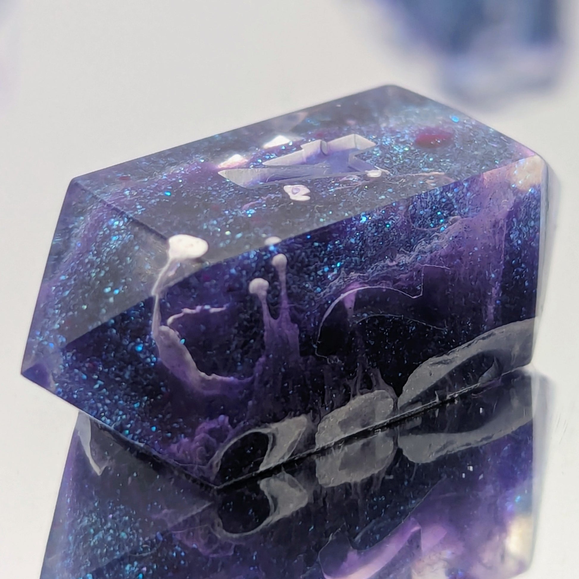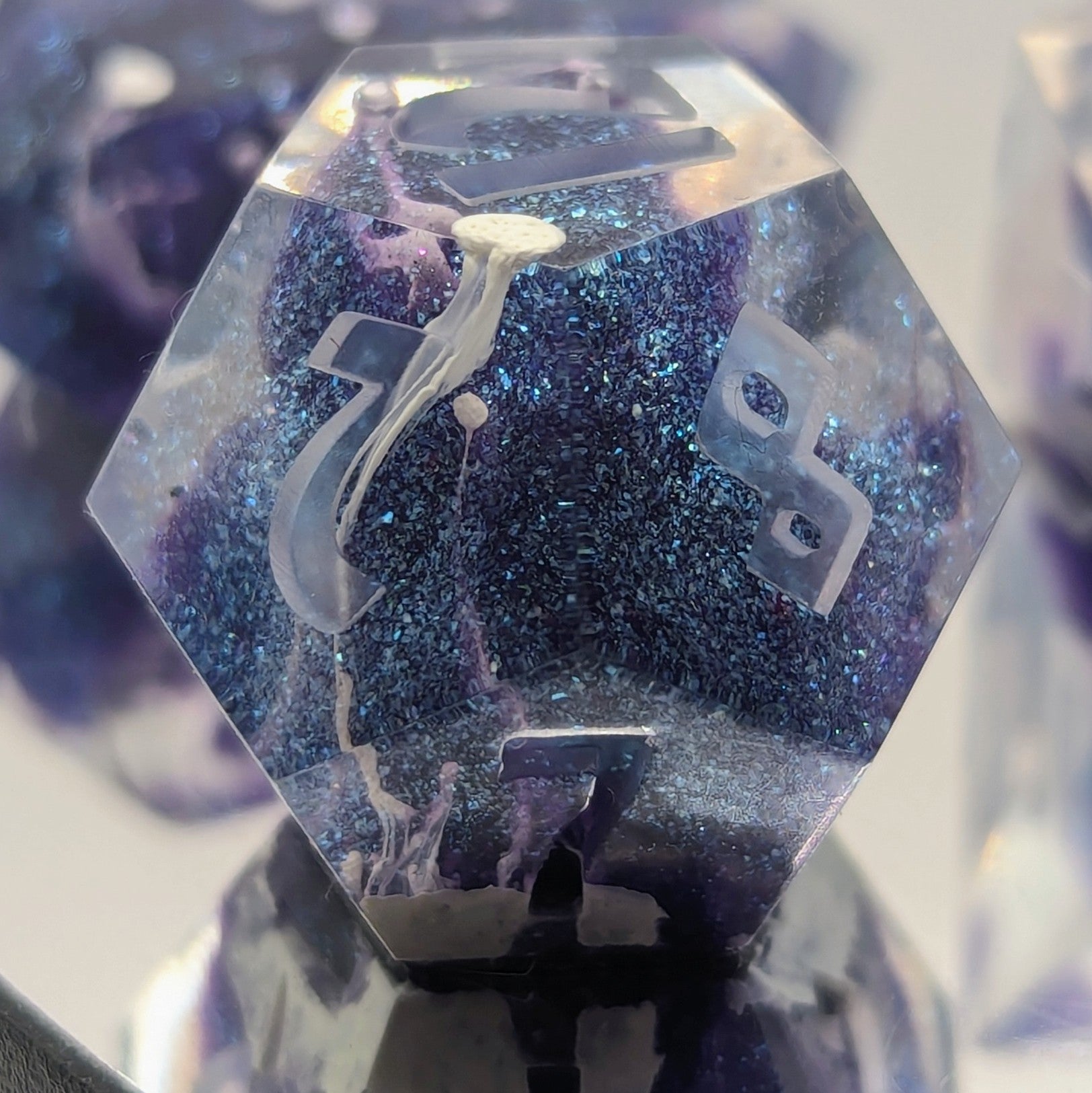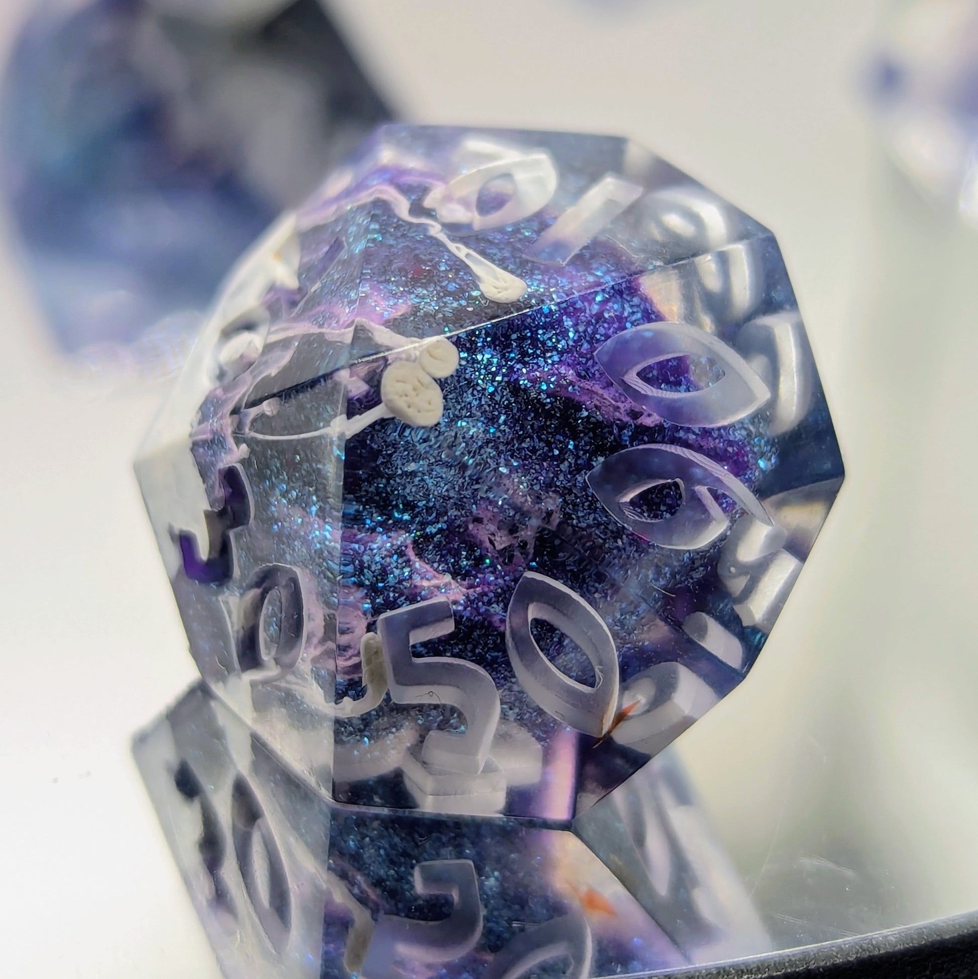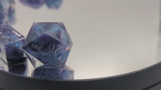 A set of 7 RPG Sharp Edged Dice that are clear with a cloud of purple-blue glitter into the center. (Includes D20, D12, D10, D%, D8, D6, D4)